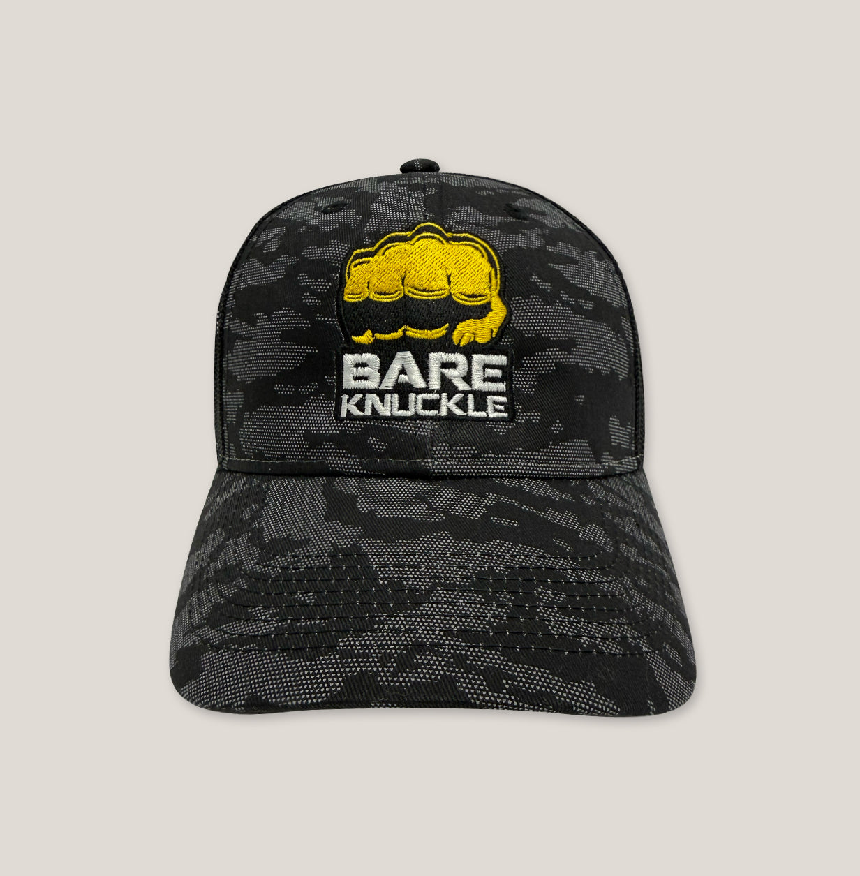 Classic BKFC attitude with a modern camo edge. The OG Black Camo Trucker Snapback features the iconic Bare Knuckle fist embroidered front and center, set against a stealth black camo pattern. Finished with a breathable trucker build and adjustable snapback, this hat is made for everyday wear—from fight night to street runs.